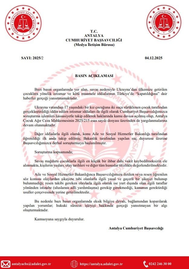 Ukrayna vatandaşı 17 yaşındaki bir kız çocuğuna iki suça sürüklenen çocuk tarafından gerçekleştirildiği iddia edilen istismar iddiaları ile ilgili olarak Cumhuriyet Başsavcılığımızca soruşturma işlemleri hassasiyetle takip edilerek haklarında kamu davası açılmış olup, Antalya Çocuk Ağır Ceza Mahkemesinin 2025/215 esas sayılı dosyası üzerinden de yargılanmalarına devam olunmaktadır.