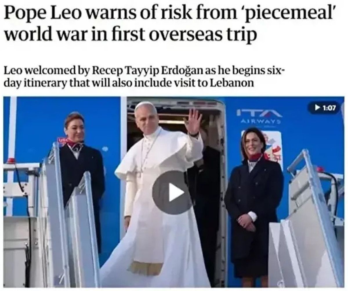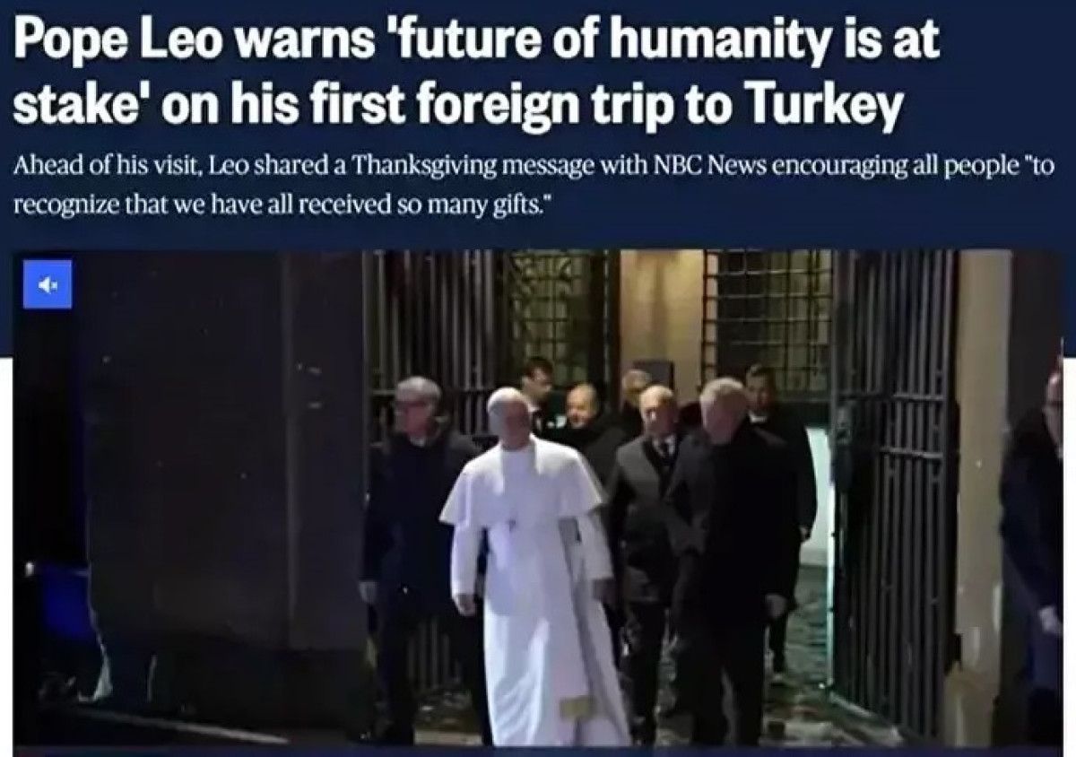 Papa 14. Leo, Türkiye ziyaretinde dünyanın ‘küresel ölçekte artan bir çatışma düzeyine teslim olmaması gerektiği’ uyarısında bulundu. Papa, ‘İnsanlığın geleceği tehlikede’ diyerek diyalog ve istikrarın teşvik edilmesi gerektiğine dikkat çekip Cumhurbaşkanı Recep Tayyip Erdoğan’ın ‘istikrar kaynağı’ olarak rol üstlenmesi çağrısında bulundu.